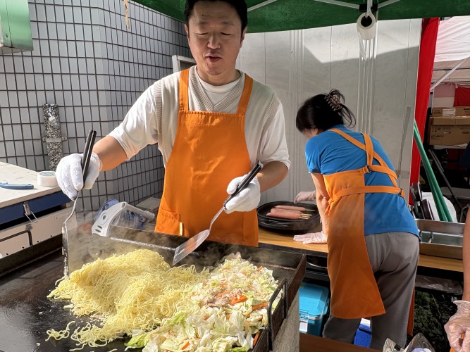 無料屋台では、昨日に引き続き焼きそば、フランクフルト、ラムネなどをご提供!