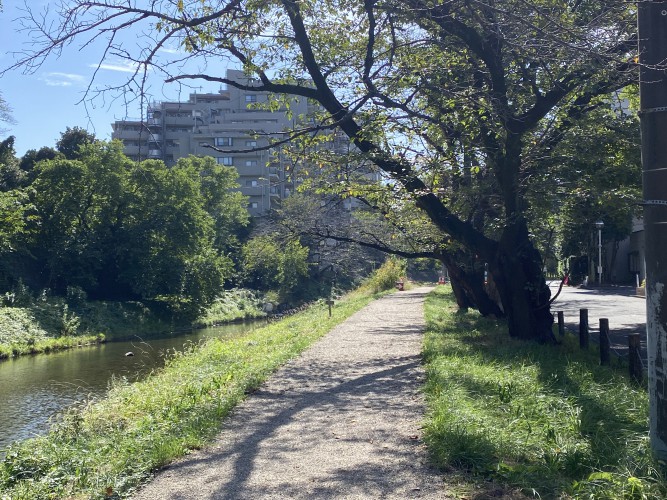 途中、穏やかな流れの川と、その両岸に続く桜並木を見かけました。