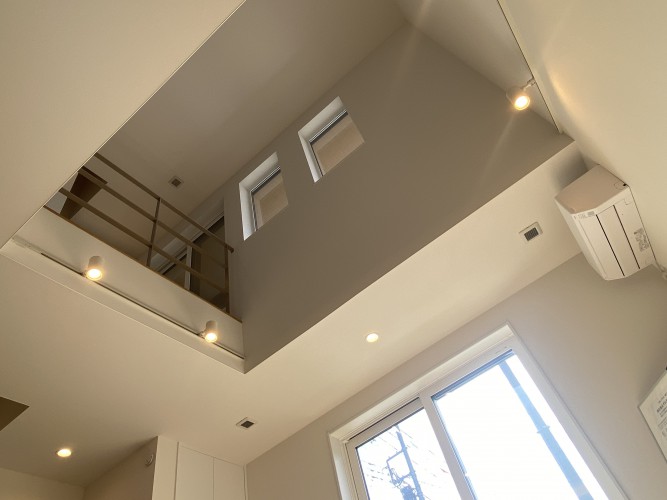 吹き抜けの上からはバルコニーの屋根越しに穏やかな光が降り注いでいます。