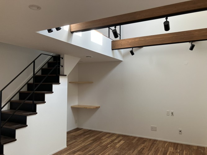 階段にはスタイリッシュなアイアン手摺を採用しています。