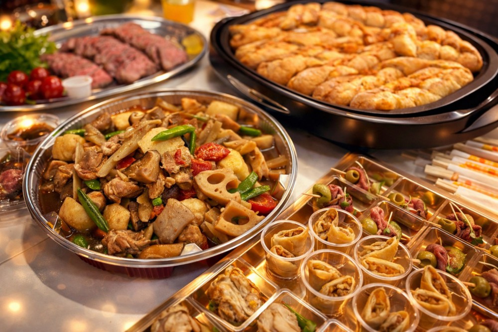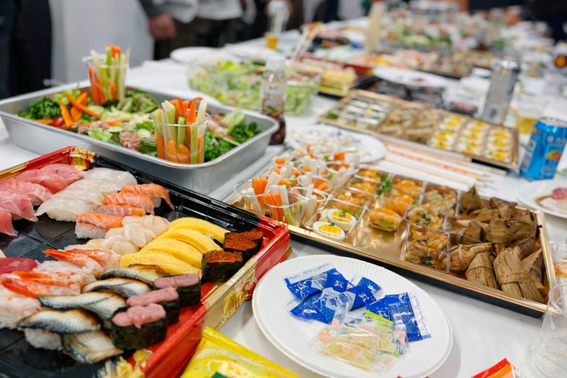テーブルには、美味しそうなケータリングやお肉がずらり。
