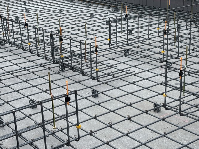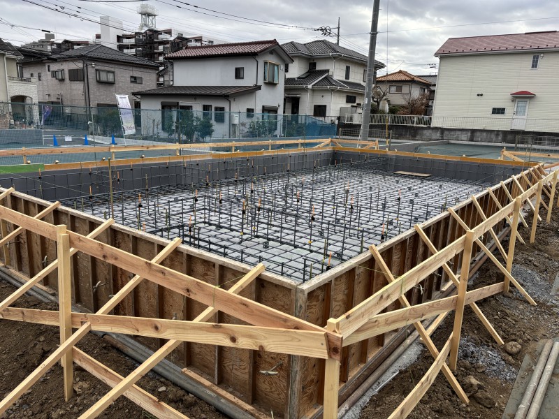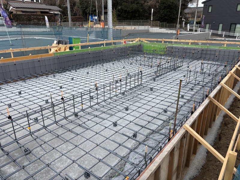 現在の現場では、基礎の配筋工事が進行中で、鉄筋が縦横にしっかりと組まれています。