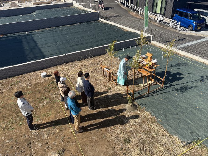 W様の区画はモデル棟のお隣なので、モデル棟のバルコニーから地鎮祭の様子を撮影することができました。