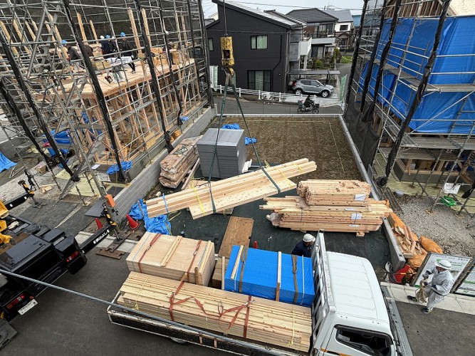 朝8時頃に現場へ行くと、3区画にはたくさんの構造材が積み上げられていました。