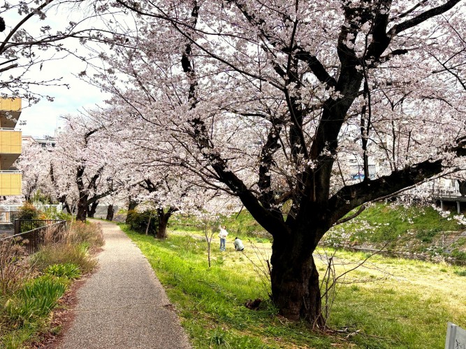 ちょうど桜が満開になっていて川沿いには見事な桜並木が広がっています。