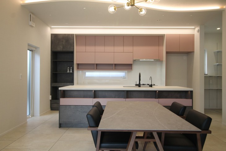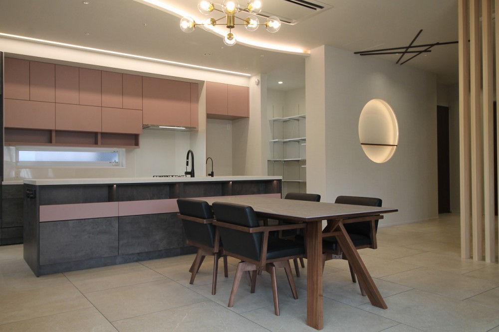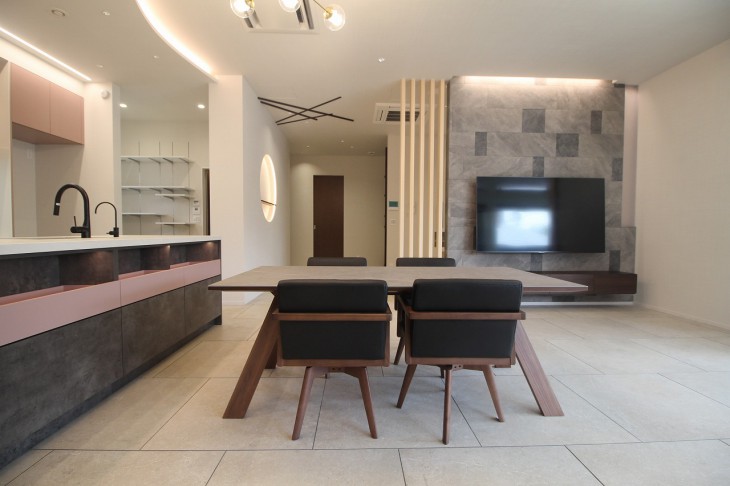 ▼間接照明を取り入れた、ゆったりとしたLDK、そしてオーダーキッチン。