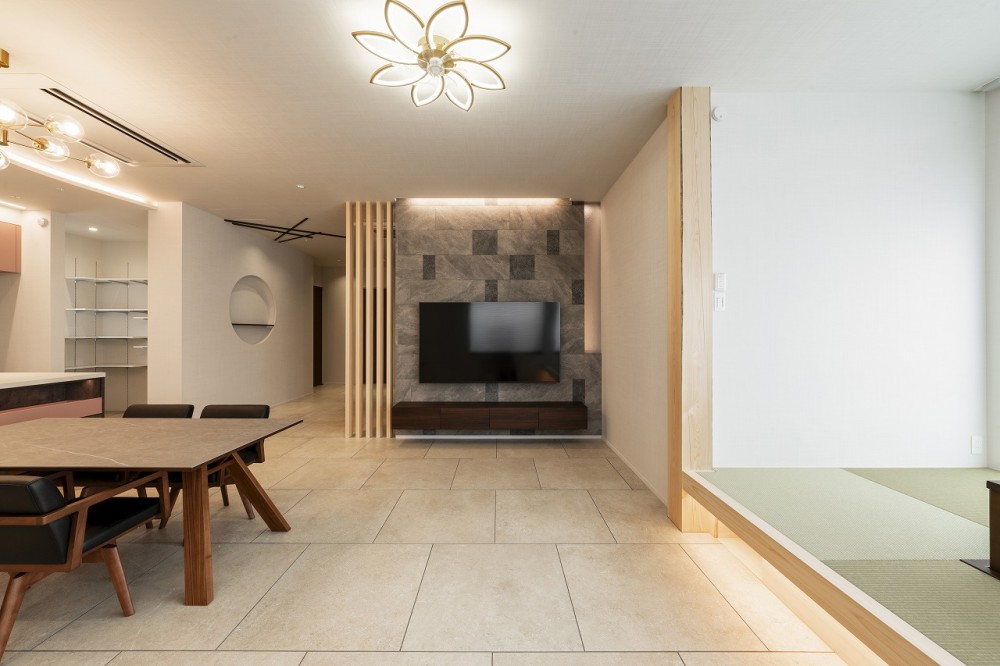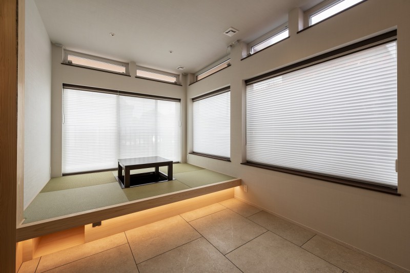足を伸ばせる掘りごたつや、空間を演出する間接照明も素敵です*
