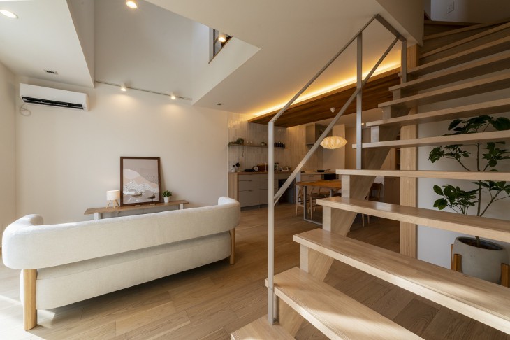 20帖の広々とした吹き抜けLDKにリビングイン階段を配置。