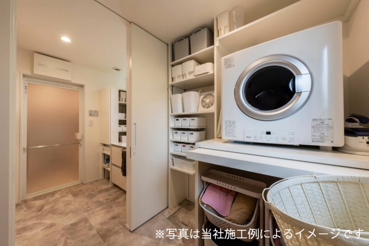 バスルーム⇔脱衣室⇔ランドリースペースが一直線につながる人気の家事ラク動線を採用。