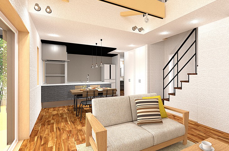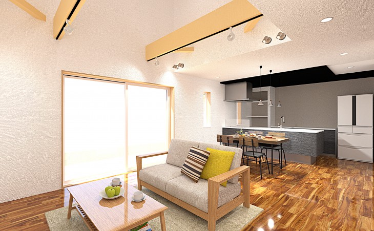 約19帖の吹き抜けLDKは、ウッドデッキに直接アクセスできる開放的な空間。