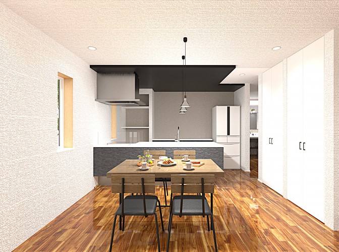 天井は空間全体を引き立てる下がり天井で仕上げ、毎日の家事や家族の時間を心地よく彩ります。