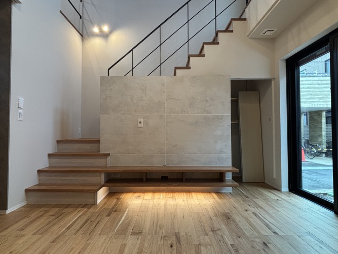 階段と一体になったデザインウォールが空間に奥行きを与えます。