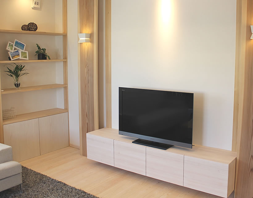 そう考えて、私たちは馴染みのある無垢材をふんだんに使った家具と建具を作りました。