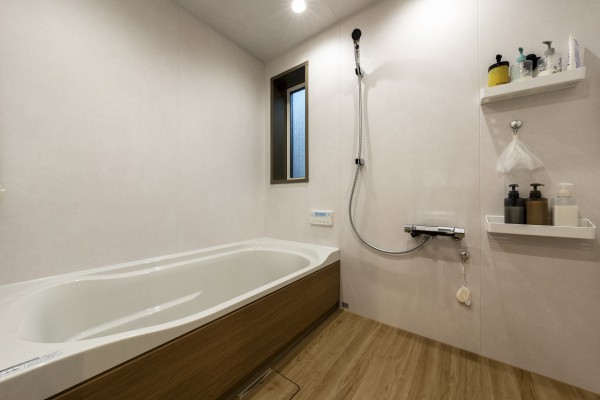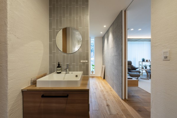 LDKと同様に、木・白・グレーの3色でまとめることで、水まわりでありながら空間全体に統一感を持たせています。