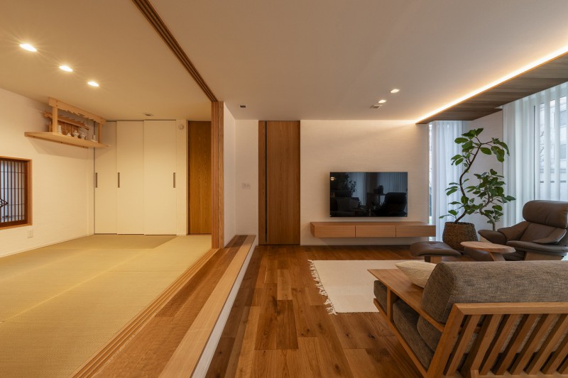 和室は約20cmの段差を設けた小上がりとし、腰掛けやすさと空間の切り替えを両立。