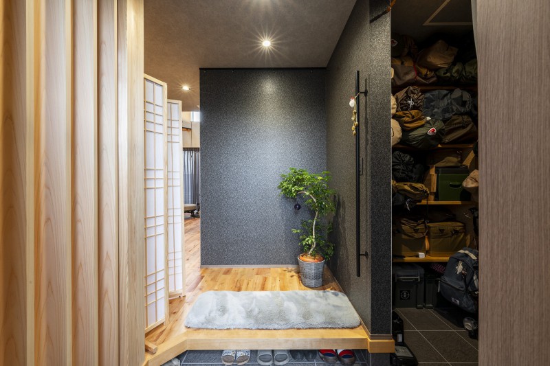 できるだけ木を使った家にしたいと思っていました。 玄関のルーバーや階段の柱には、高砂建設こだわりの西川材を。1階の床材や、ウッドワンのキッチンなども木製を選びました。