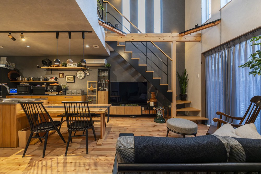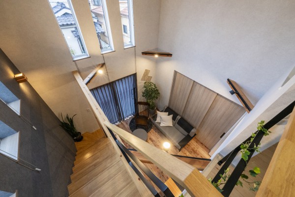 LDKから吹き抜けを見上げたときの開放感と、青い空。