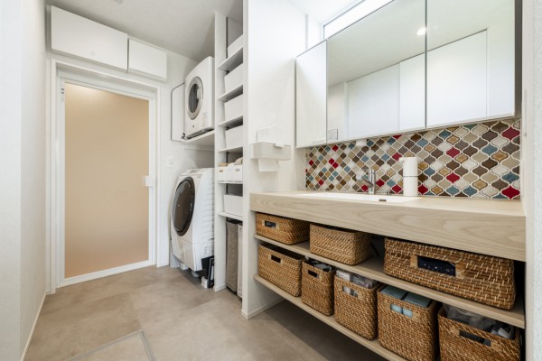 玄関横にはすぐ手が洗える洗面化粧台を設置し、タイルの色味も大人しめに調整。