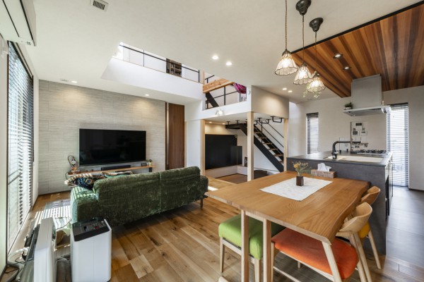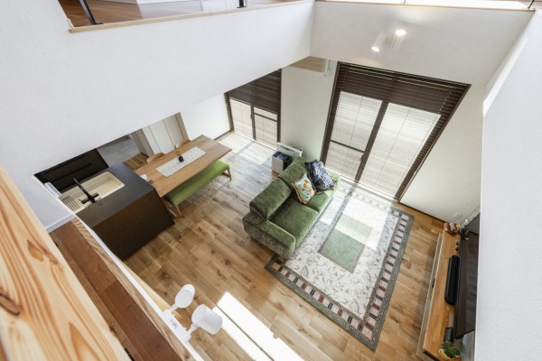 リビングには大きな吹き抜けと無垢床を採用し、素足でも温かみを感じられる空間に。