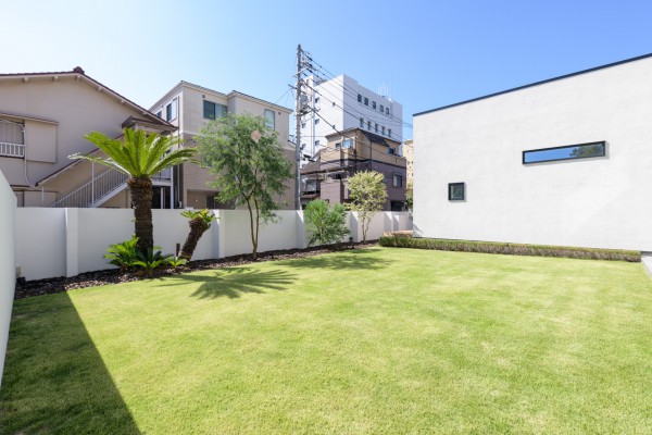 人通りのある住宅地にありながら、敷地内に入るとアメリカ・フロリダをイメージした庭が広がり、まるで公園の中に建物が佇んでいるようです。