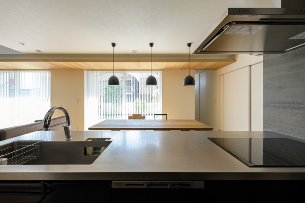 アクセントとして木質の下がり天井をデザインし、特別仕様のキッチンやダイニングテーブルと組み合わせることで、ナチュラルで上質な空間に仕上がっています。