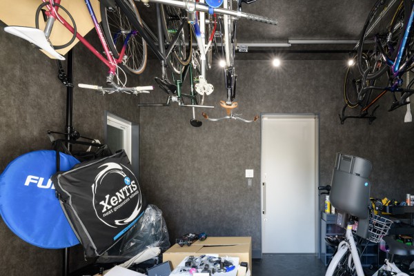 ガレージ奥に設けたホビールームには、趣味のロードバイクが所狭しと並びます。