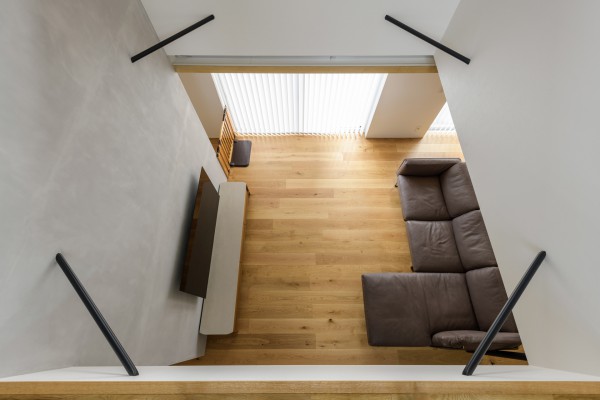 庭に面した大きな窓から陽の光が差し込むリビングは、オイル塗装されたオーク系フローリングを使い、抑えたトーンで統一された落ち着きの空間。