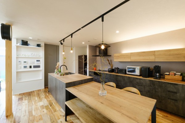 奥様が選んだ木目天板の「キッチンハウス」は、吊り戸棚の間接照明やペンダントライトと合わせてお洒落な雰囲気に。日々の料理が楽しくなる、居心地のいい空間になっています。