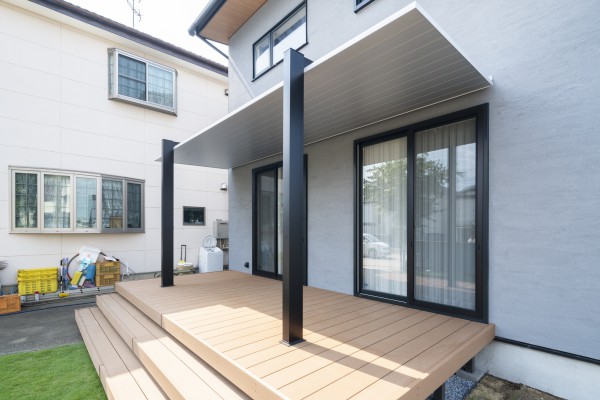 わが家の外観は、グレーの外壁にウッドデッキが印象的。