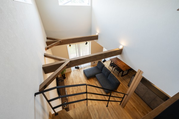 無垢オークのフローリングや木の天井、そして階段のアイアン手すりが、自然素材とアイアンの質感を引き立て、落ち着きがありつつも表情豊かな空間になりました。