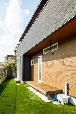 外観は黒をベースにした四角いフォルムに、羽目板貼りを加えて温かみをプラス。