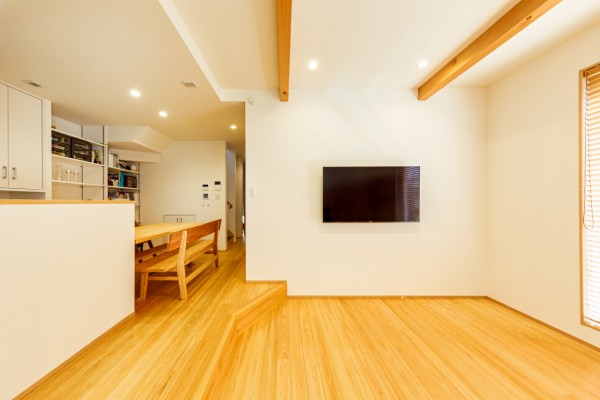 住まいの一番の特徴は、広々としたステップダウンフロアのリビング。対面キッチンからダイニング・リビング・庭まで見渡せるので、お子様が元気に走り回っても安心。のびやかに暮らせる空間が広がります。