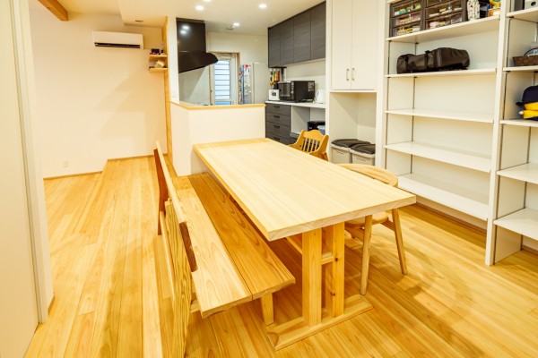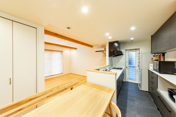 キッチン脇には無垢の木をアクセントに。ダイニングを横並びに配置することで、配膳や片付けがスムーズになり、お子様のお手伝いもしやすい工夫を凝らしました。