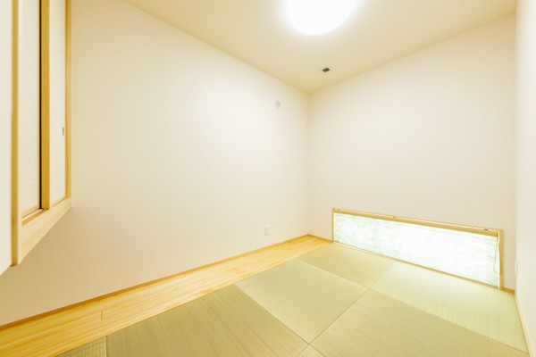 和室の地窓や寝室のハイサイドライト、重厚感のある玄関ドアがアクセントとなり、シャープさと木のぬくもりが調和しています。