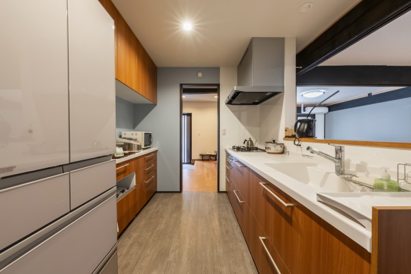 T様邸では建物の柱や梁を残しつつ、内装・外装・設備を刷新。長年の味わいを感じられる柱や梁をあえて見せることで、時を重ねた風合いと快適性を両立させた空間に仕上がりました。美しい庭を臨む26帖のLDKや縁側も旧宅のつくりを活かしつつ生まれ変わっています。