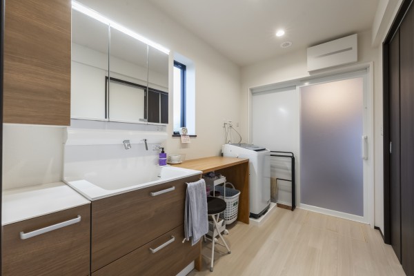 契約後も大工さんと直接相談でき、細かい要望にも柔軟に対応。たとえば玄関の段差も、解体後に可能か確認しながらフラットに仕上げることができ、「本当に嬉しかった」とお話くださいました。洗面横の造作テーブルや、奥様お気に入りのブルーのクロスなど、暮らしに便利で心地よい工夫も随所に取り入れています。