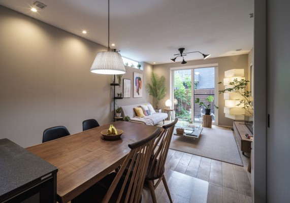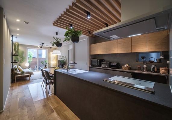 キッチンは奥様のお気に入りポイント。「料理中も家族と話せる配置にしたかったんです」と奥様。リブ天井のスポットライトやリアルウッドの吊戸棚が空間を引き締めています。ダイニングテーブルとリビングが一直線になっているため、配膳や後片付けもスムーズ。「子どもたちも自然にお手伝いしてくれるようになりました」と嬉しそうに話してくださいました。