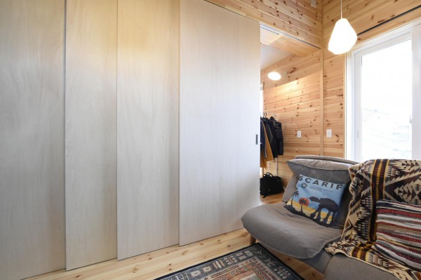 2階に上がると、広めに設けた寝室と、テレビのあるご夫婦のリラックス空間が広がります。「子供が寝静まった後は、夫婦で映画を楽しんでいます。 在宅勤務のときは私の仕事部屋にもなるんですよ」とご主人。家族だけでなく、ご夫婦の時間も大切にできる空間です。
