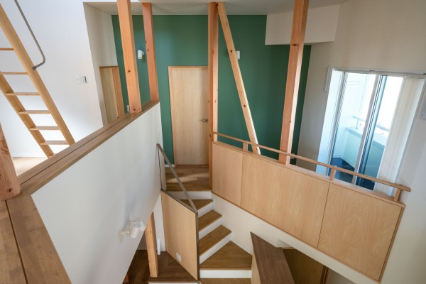 リビング中央に設けられた特徴的な階段は、完成時にU様が思わず声をあげるほど。
