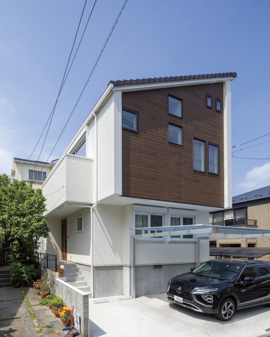 玄関と水回りを完全分離した二世帯スタイルのY様邸。シンプルモダンをベースにしながらも外観には和のエッセンスを取り入れ、街並みにも自然に馴染むハイセンスなたたずまいとなりました。深い軒を設けた屋根は、雨漏り防止や日よけ効果を発揮するだけでなく、将来のメンテナンス性も考えて瓦を採用。安心と美観を兼ね備えています。