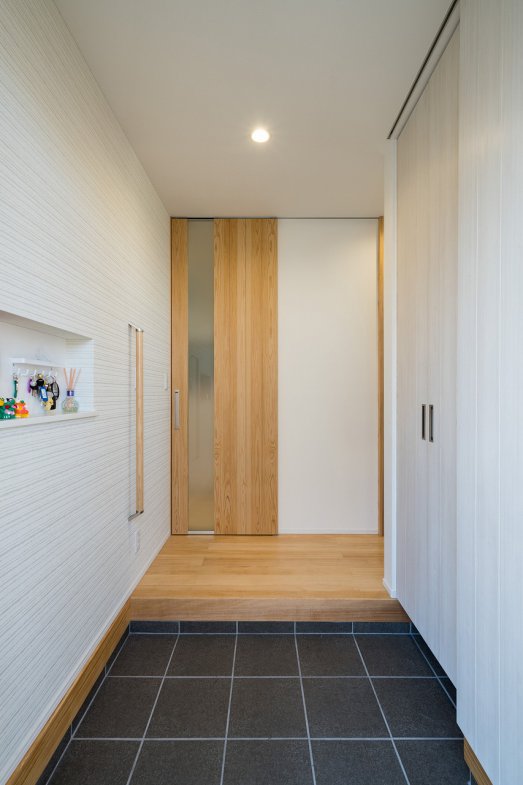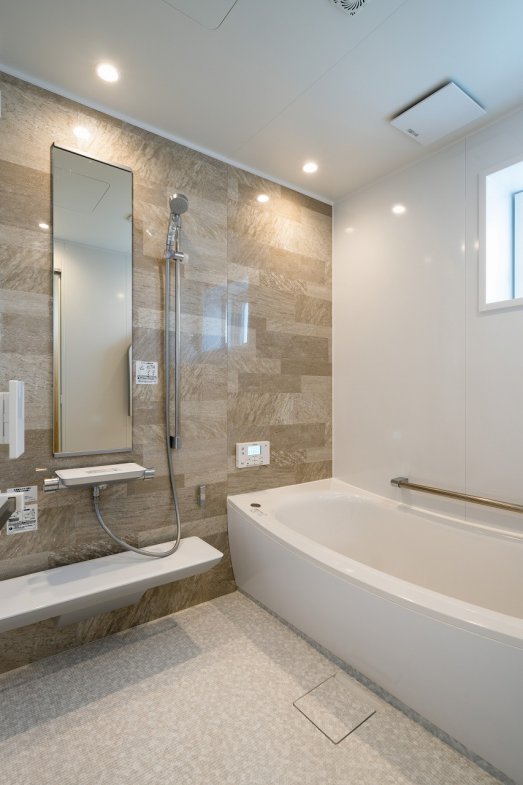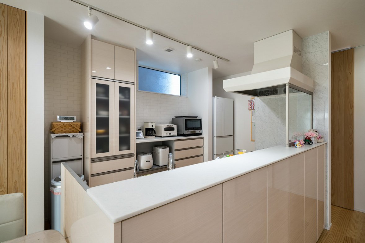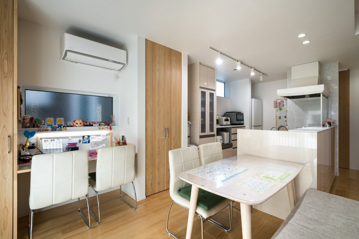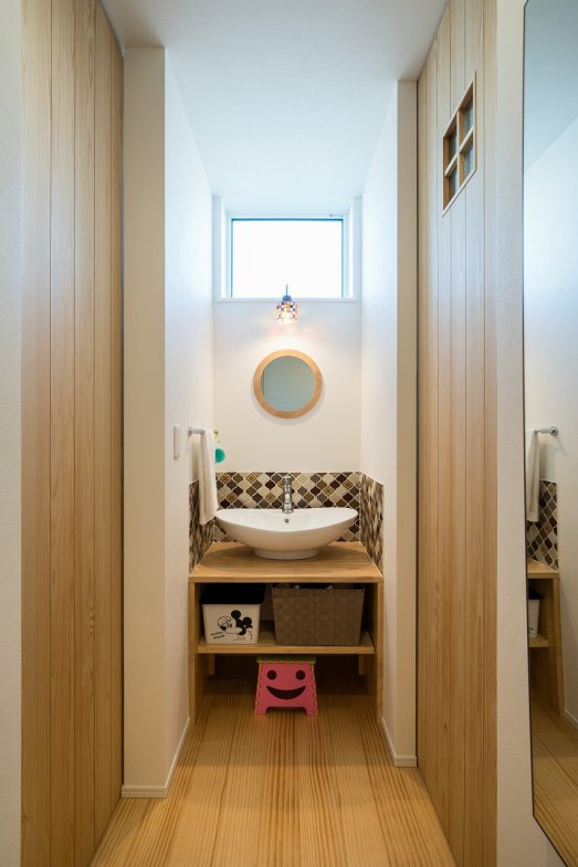 奥様のこだわりは、以前のお住まいで悩んでいた家事動線の改善です。外遊びから帰った子どもたちがそのままお風呂に入れる動線や、バスルームとキッチンをつなげた効率的な動線など、子育て世代に嬉しい工夫が施されています。「前の家ではお風呂とトイレが離れていて不便でした。細かい悩みもひとつひとつ聞いてくれて、実現できて嬉しかったです」とI様。