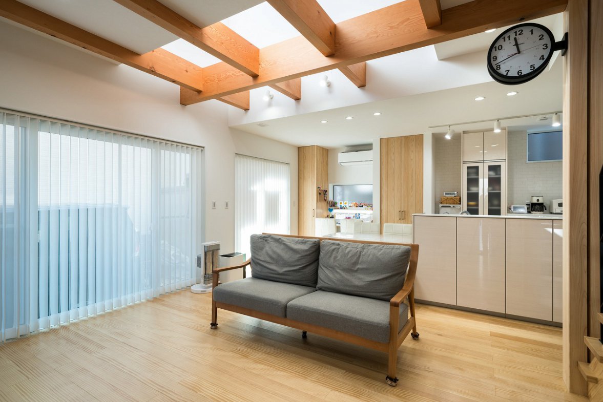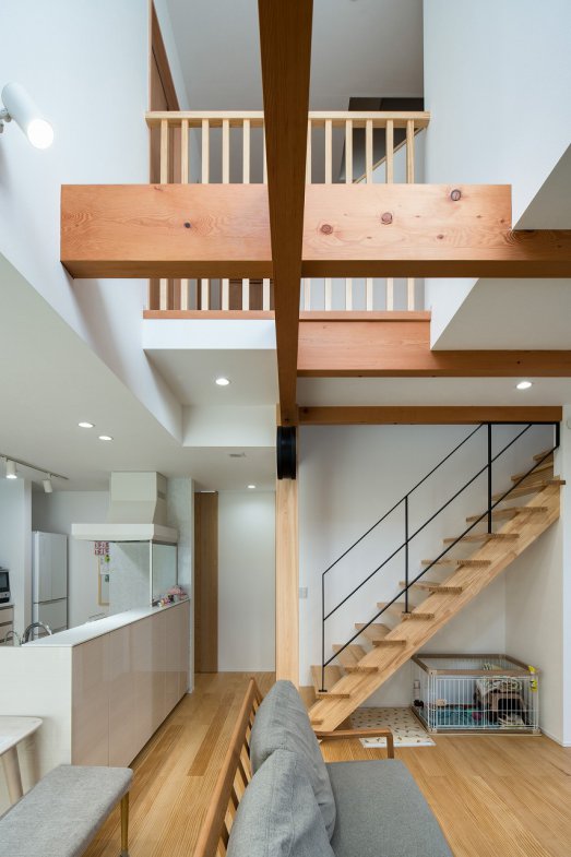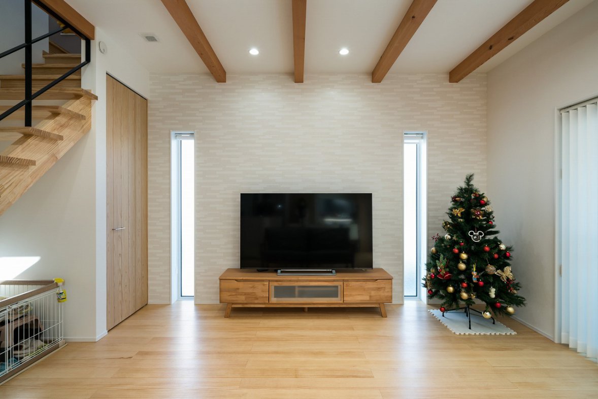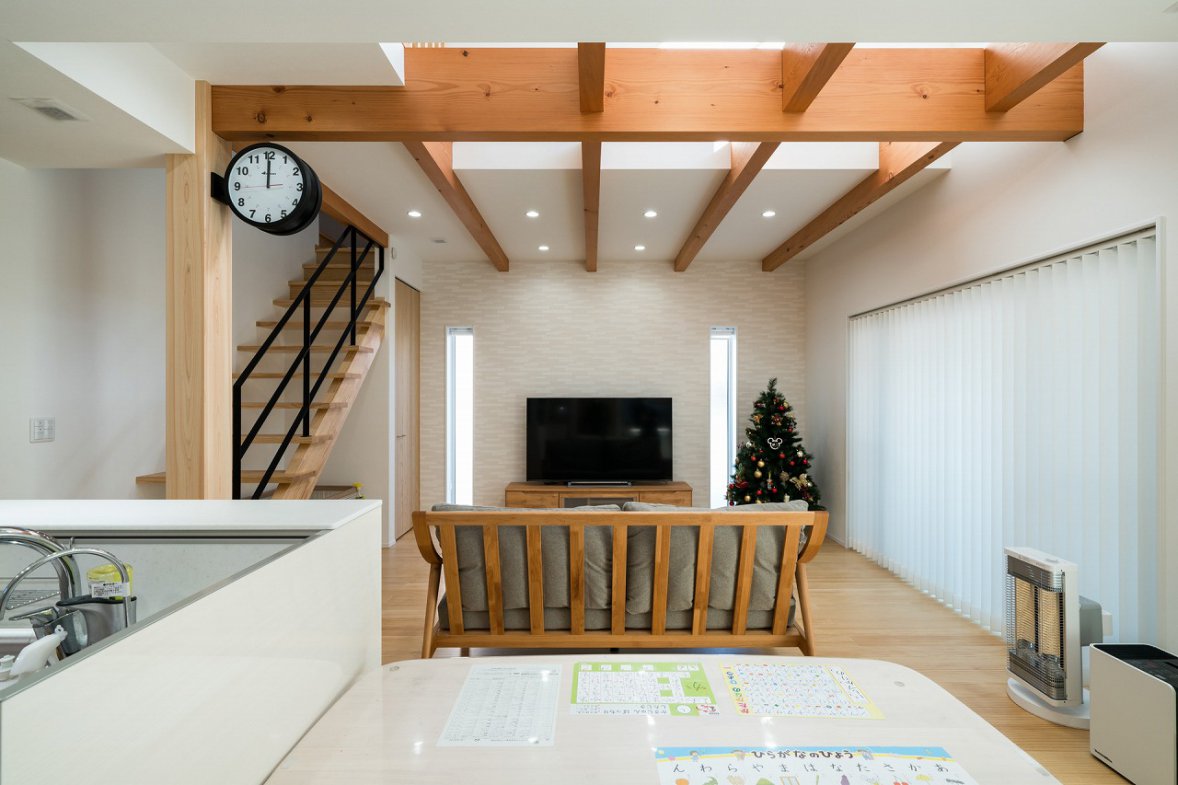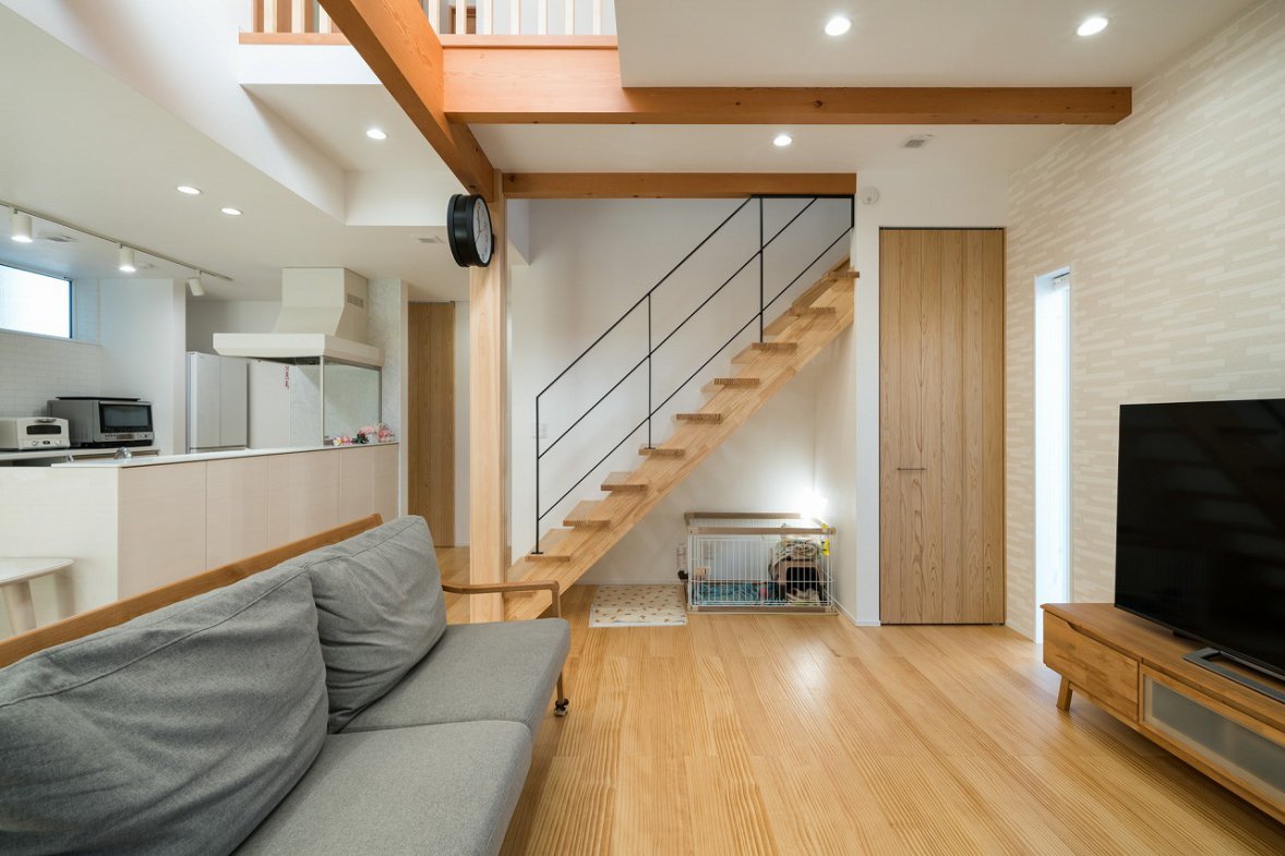 I様邸は、大工さんとの距離が近く、木材にこだわる会社で建てたいという想いから高砂建設での家づくりが始まりました。モデルハウスに入った際のカラリとした空気感が決め手となり、吹き抜けからの採光や一体感のあるリビングで、愛犬も含めた家族全員が快適に暮らせる住まいが完成しました。