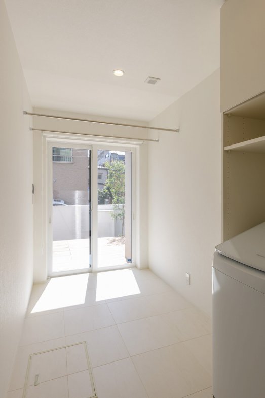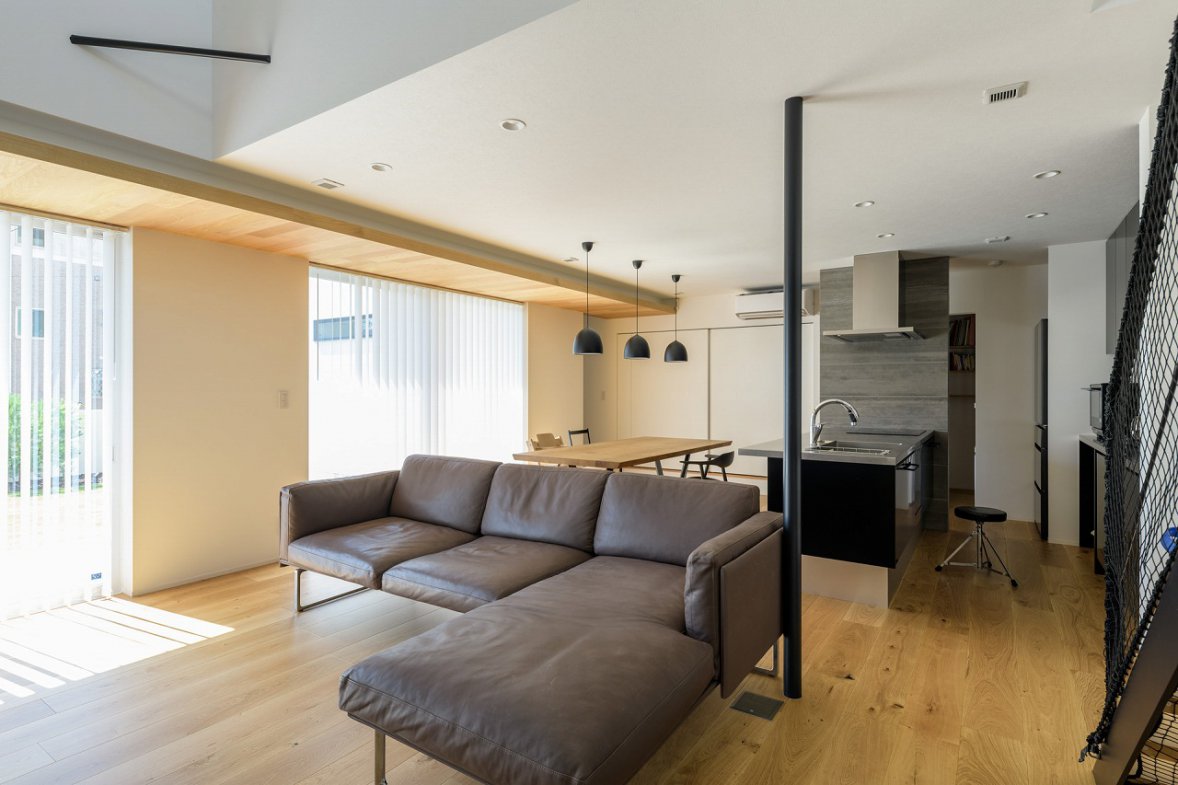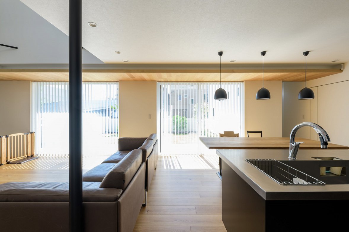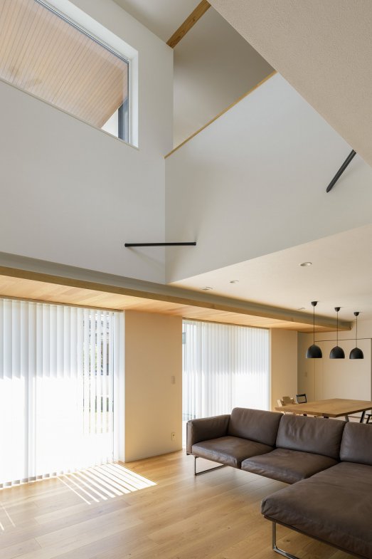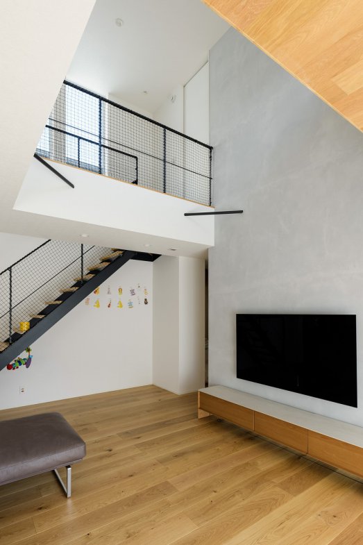 陽光が降りそそぐ三層吹き抜けの家