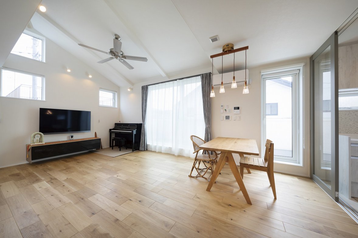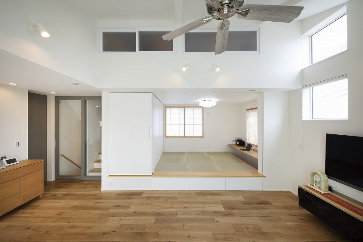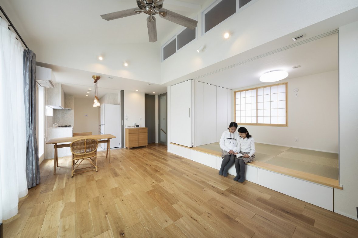 設計では「明るさ」を大切に。LDKを2階に設け、勾配天井とシーリングファンで開放感と快適さを演出。床には幅広のオーク挽板フローリングを採用し、一角には小上がりの畳コーナーを配置しました。畳下は絵本などを収納できるスペースとなっており、ご家族の暮らしをサポートします。ご主人は小屋裏にテレワークスペース兼トレーニングルームを確保し、趣味や仕事も充実できる空間に。