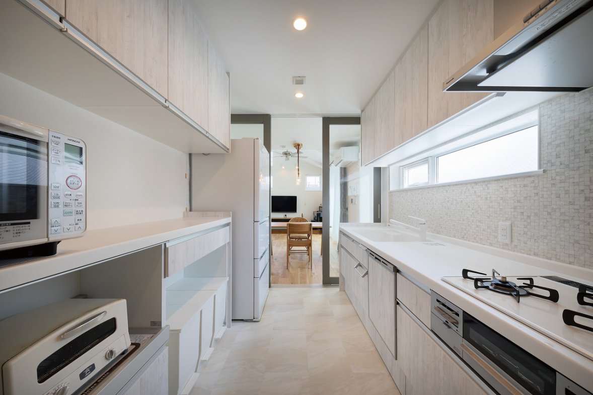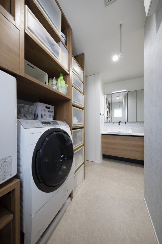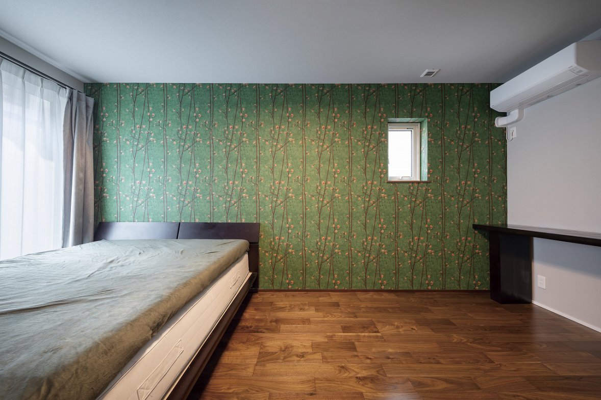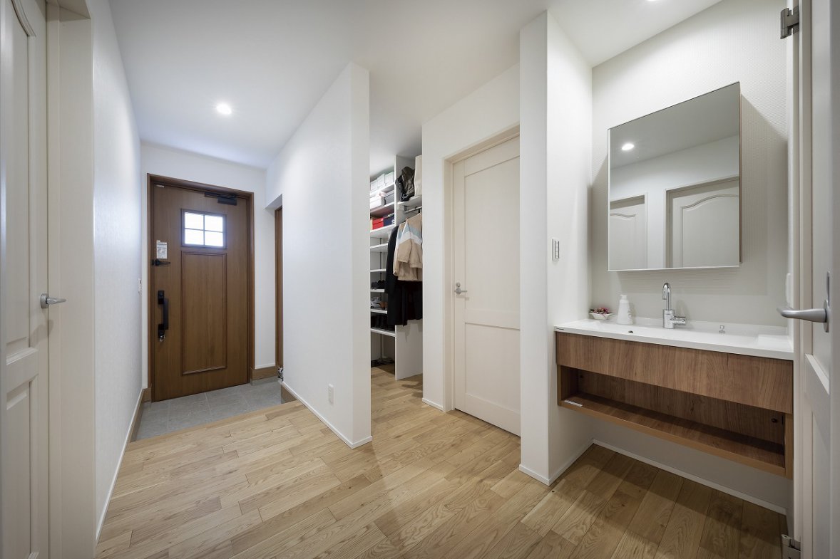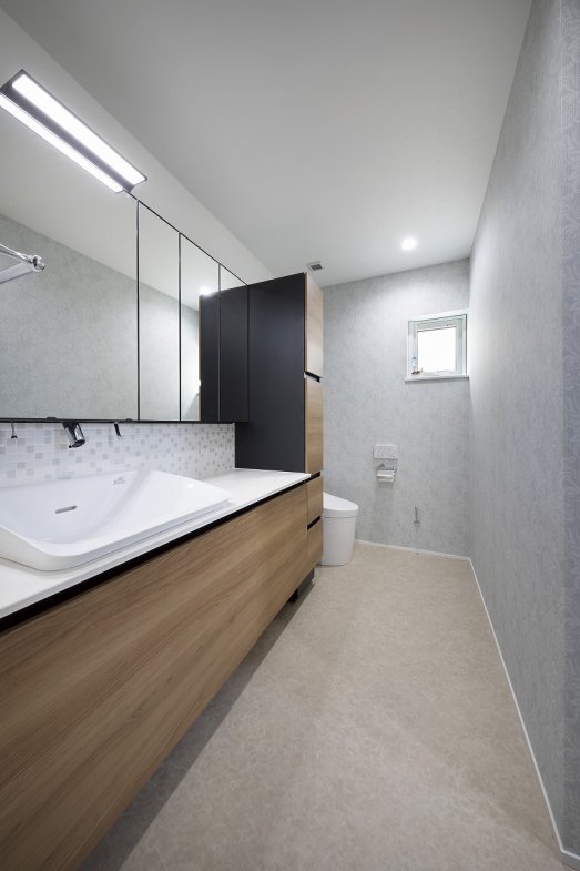 水回りにも工夫を凝らしました。キッチンは独立型で、フルハイトのガラス戸により見通しの良さを確保。トイレと洗面を一体化したスペースはホテルライクな仕上がりで、ペーパーホルダーの金具ひとつにまで奥様のこだわりが反映されています。1階には主寝室を配置し、アクセントにはゴッホの絵をモチーフにしたクロスを採用。玄関ホールには手洗い場を備えたSICを設け、コンパクトながら使いやすさを追求しました。