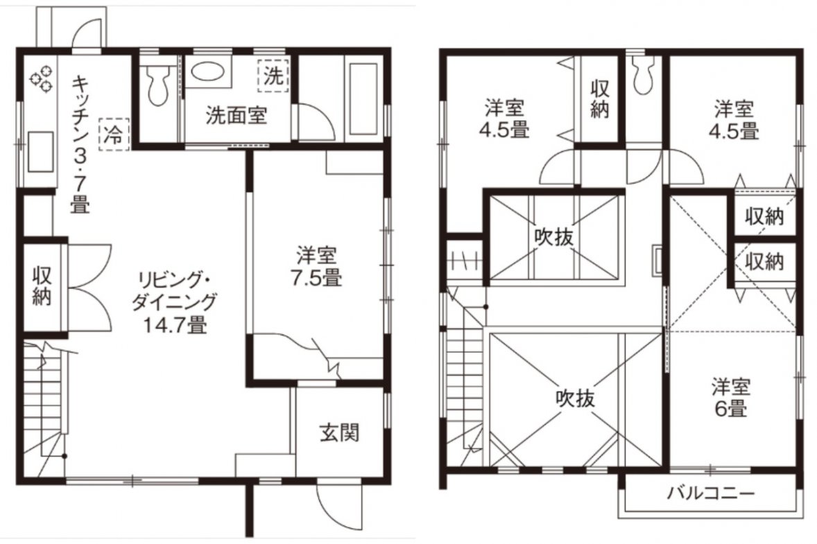 玄関ドアやバルコニーも木質感のあるデザインを選び、ナチュラルな印象に。1階の小上がり洋室は、お子さまが小さいうちは子ども部屋として使用でき、扉を開けるとひとつながりのワンルームとしても活用可能です。吹抜けを通して2階の様子も見渡せる、開放的な住まいを実現しました。