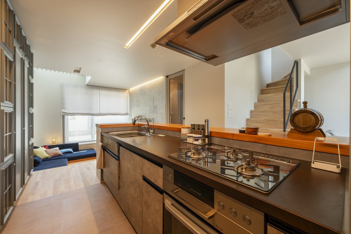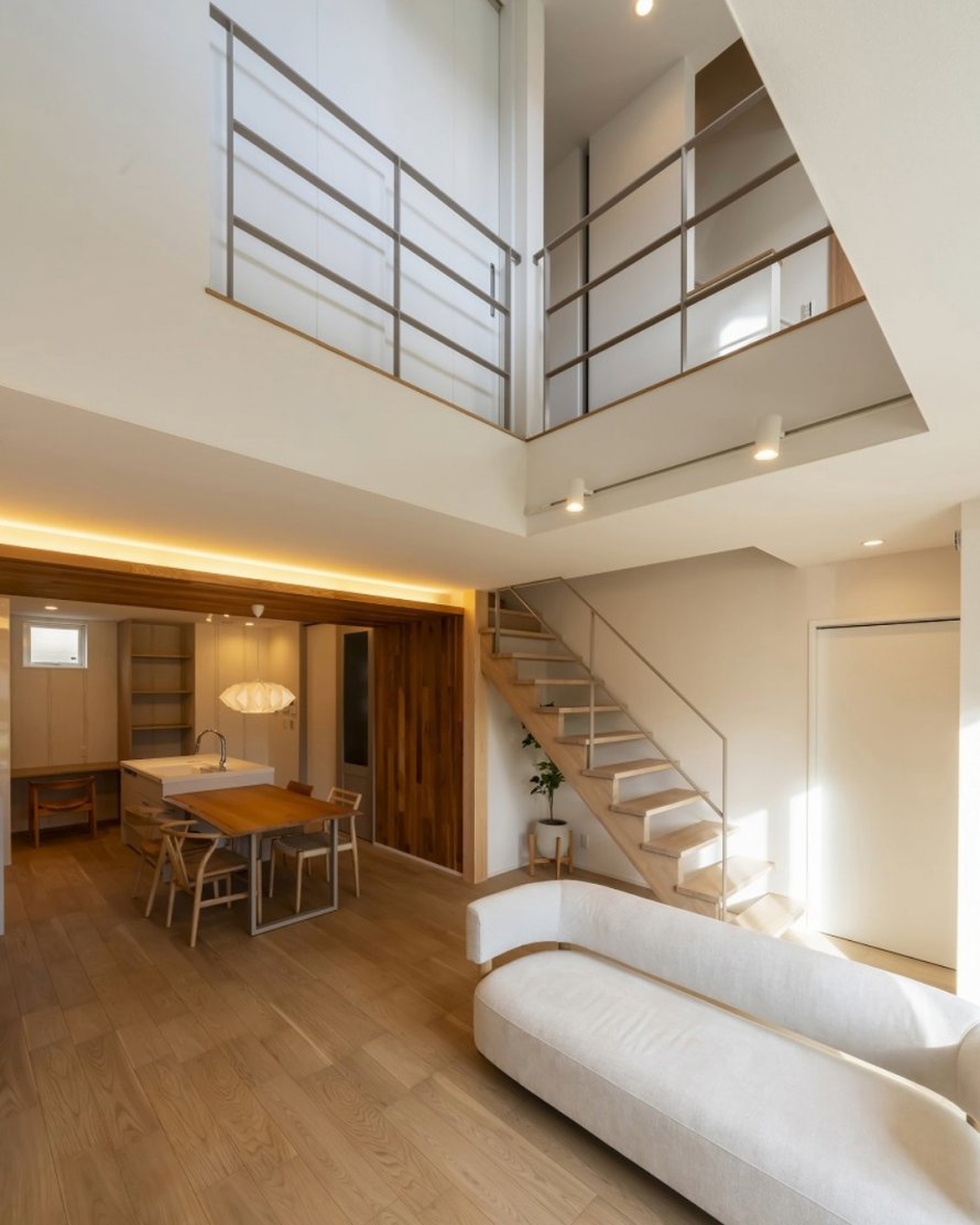 高砂建設の設計士、M氏の自邸。南北に高低差のある土地を活かし光と風を取り込んだ住まいは、30坪という限られた面積ながら、どこにいても家族の気配を感じつつ、居心地の良いスポットを沢山作った「ワンルームハウス」。ご家族の趣味と快適性を両立した設計です。
