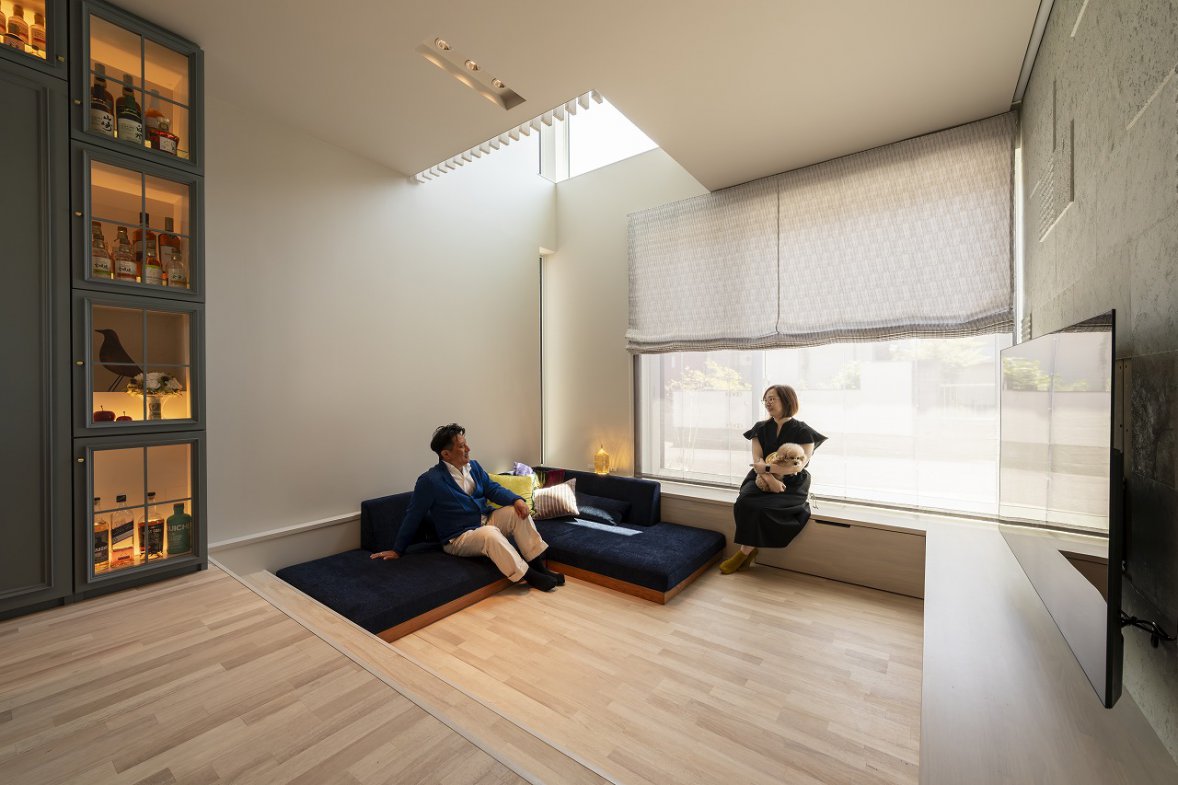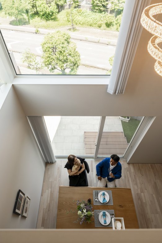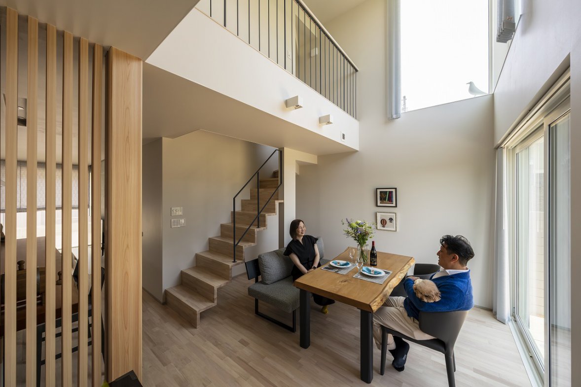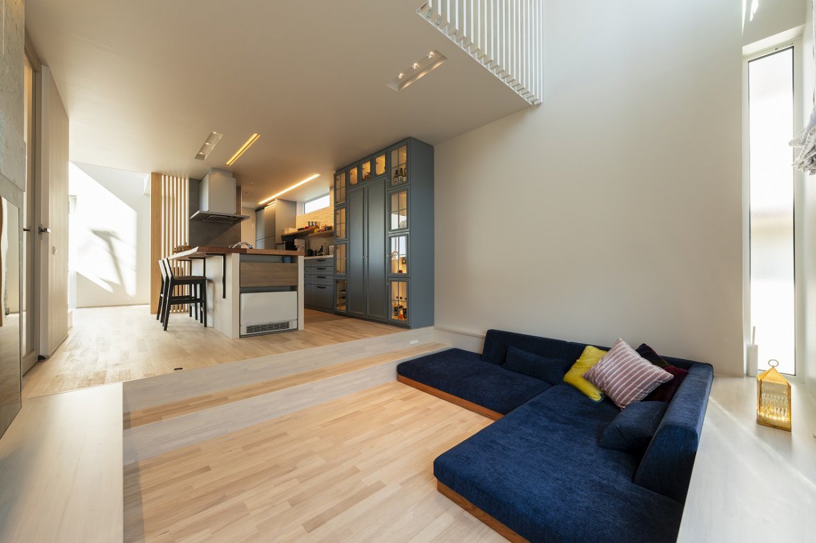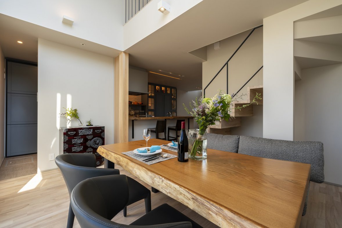 生活の大部分を過ごすリビング空間を最大限広く確保するため、水回りや居室は2 階に配置。造作家具や照明計画にもこだわり、落ち着きと遊び心が共存する空間に仕上げました。吹き抜けやどこにでも腰かけられるピットリビング、回遊動線は人にも愛犬にも心地よい暮らしを演出。洗面や浴室、屋根裏スペースまで、設計士ならではの工夫が光る住まいです。家族の「好き」と「暮らしやすさ」をかたちにした、〈完全自由設計〉の高砂建設のポテンシャルを存分に生かした住まいが完成しました。