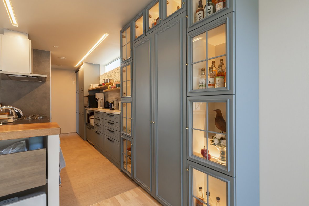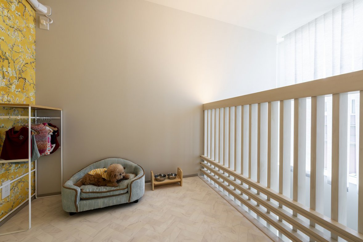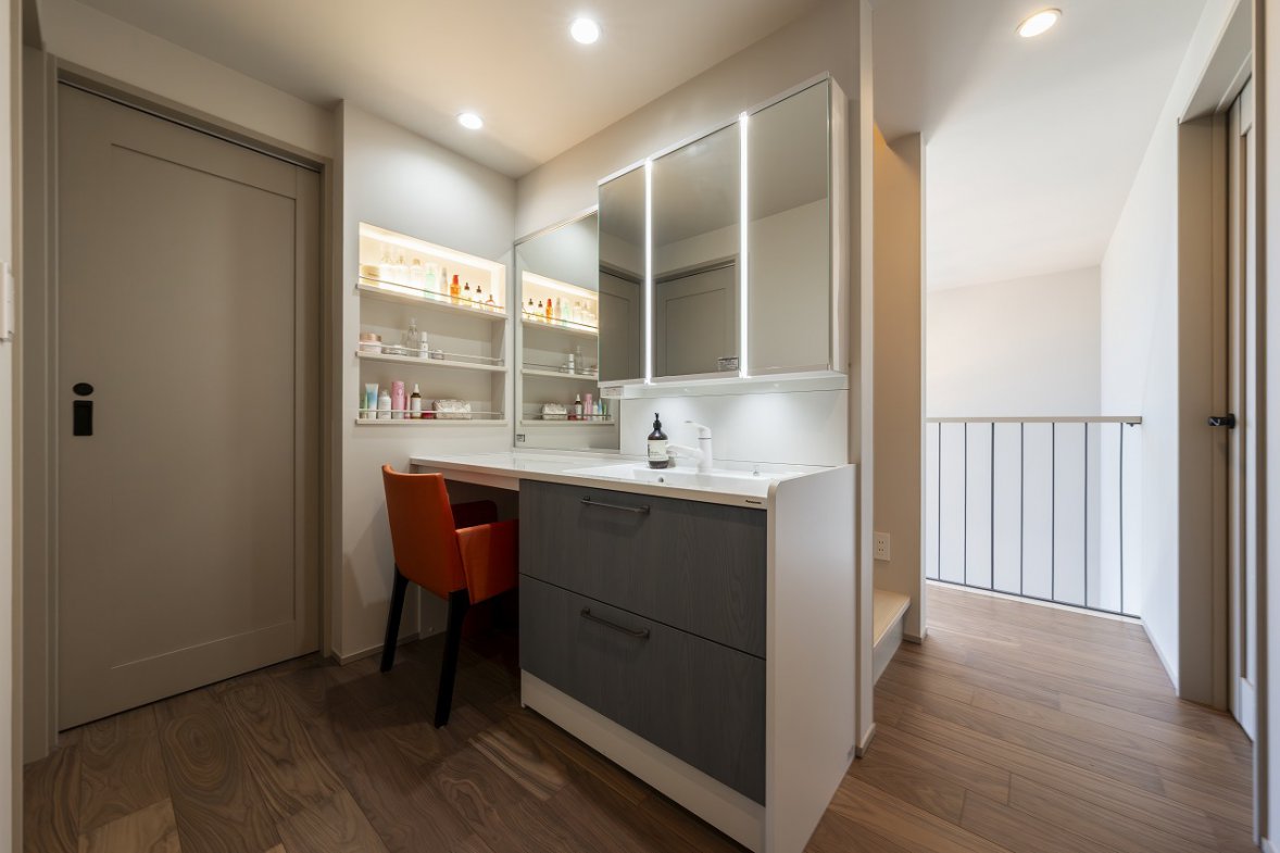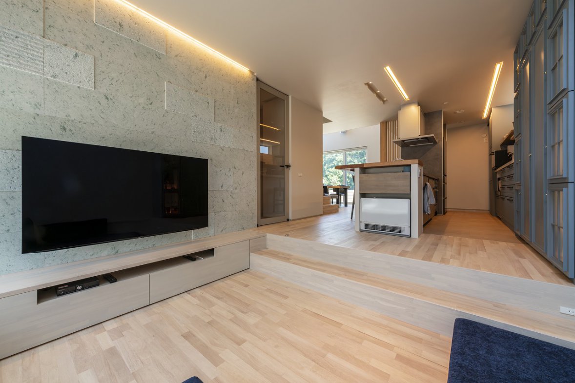 生活の大部分を過ごすリビング空間を最大限広く確保するため、水回りや居室は2 階に配置。造作家具や照明計画にもこだわり、落ち着きと遊び心が共存する空間に仕上げました。吹き抜けやどこにでも腰かけられるピットリビング、回遊動線は人にも愛犬にも心地よい暮らしを演出。洗面や浴室、屋根裏スペースまで、設計士ならではの工夫が光る住まいです。家族の「好き」と「暮らしやすさ」をかたちにした、〈完全自由設計〉の高砂建設のポテンシャルを存分に生かした住まいが完成しました。