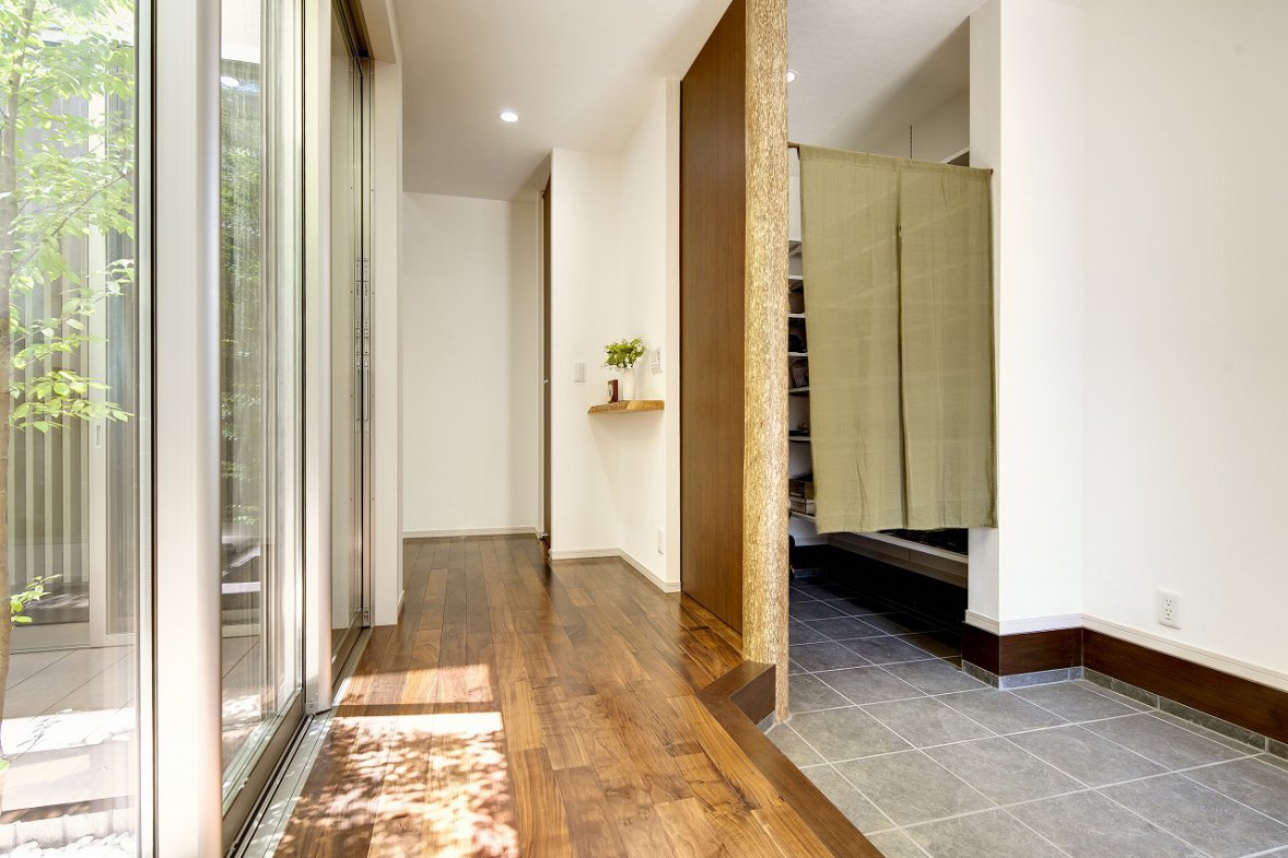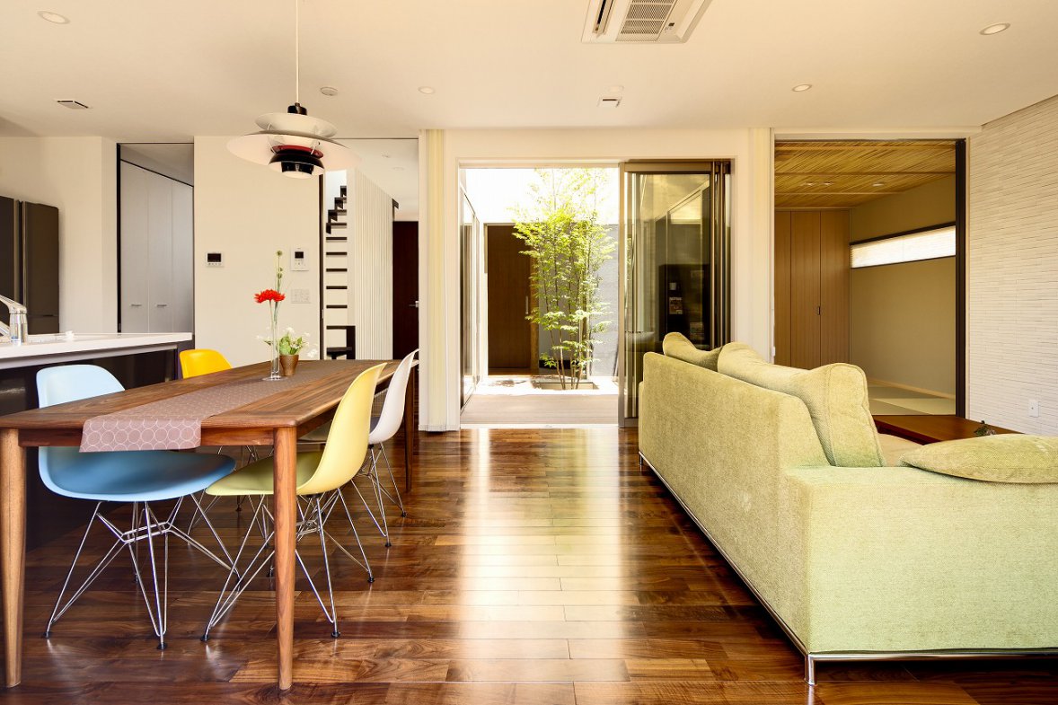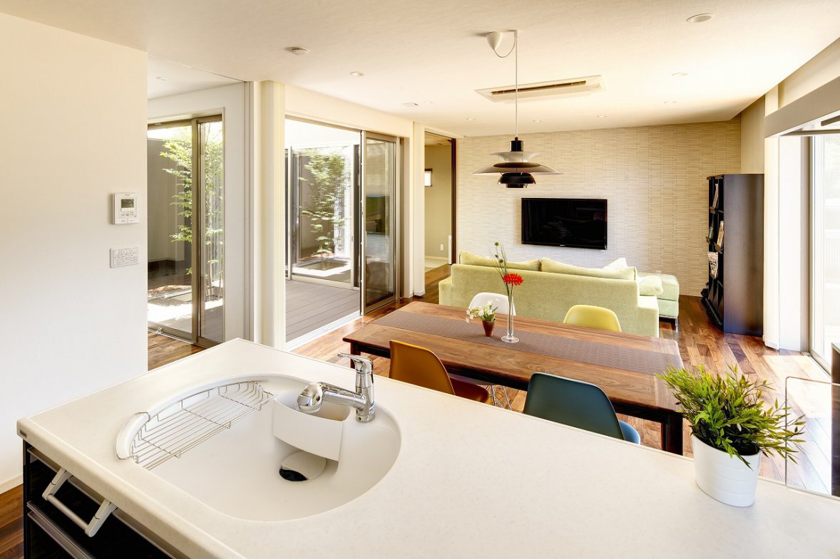 強さと性能、そしてデザインにこだわった住まいを望んでいたご主人。「四季を感じられる家にしたいと思っていました。窓が多くて明るい家に憧れましたが、外から丸見えになるのは嫌で悩んでいました」と振り返ります。そこで高砂建設がご提案したのは「中庭のある家」。家の中心に中庭を設け、大きな開口部を中庭に向けることで、開放感とプライバシーを両立しました。「どの部屋にも光が届くので、家全体がとても明るいんです」とご主人。